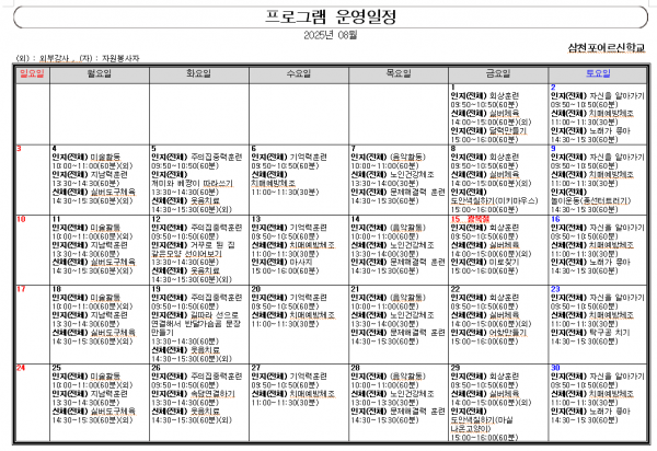2025년 8월 프로그램일정표 페이지 정보 작성자 운영자 작성일25-07-28 15:29 조회97회 댓글0건 본문 2025년 8월 프로그램일정표입니다. 센터 일정에 따라 변경 될 수 도 있습니다 댓글목록 등록된 댓글이 없습니다. 이전글 다음글 목록