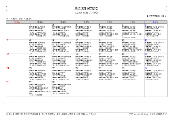 2005년 9월 프로그램일정표입니다. 페이지 정보 작성자 운영자 작성일25-09-01 16:07 조회64회 댓글0건 본문 2025년 9월 프로그램일정표입니다. 센터 일정에 따라 변경 될 수 도 있습니다 댓글목록 등록된 댓글이 없습니다. 이전글 다음글 목록
