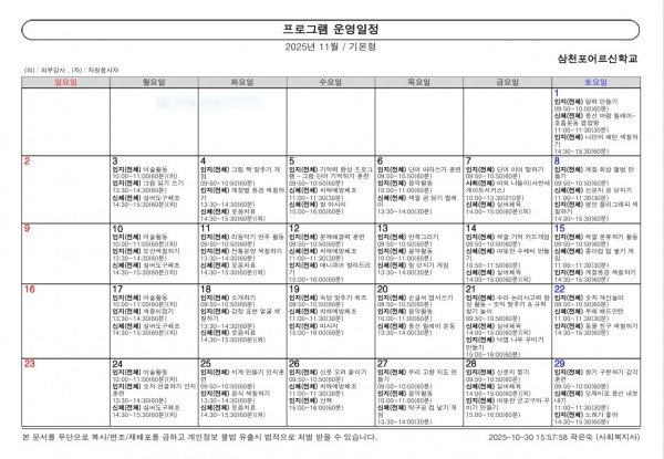 2025년 11월 프로그램 일정표입니다. 페이지 정보 작성자 운영자 작성일25-11-14 23:45 조회23회 댓글0건 본문 2025년 11월 프로그램 일정표입니다. 댓글목록 등록된 댓글이 없습니다. 다음글 목록