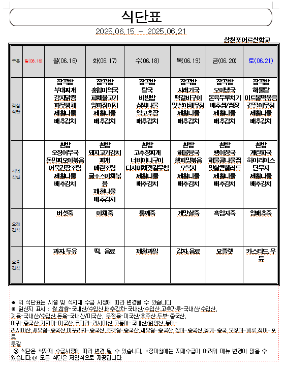 2025년 6월 셋째주 식단표 페이지 정보 작성자 운영자 작성일25-06-18 15:11 조회16회 댓글0건 본문 2025년 6월 셋째주 식단표입니다 댓글목록 등록된 댓글이 없습니다. 이전글 다음글 목록