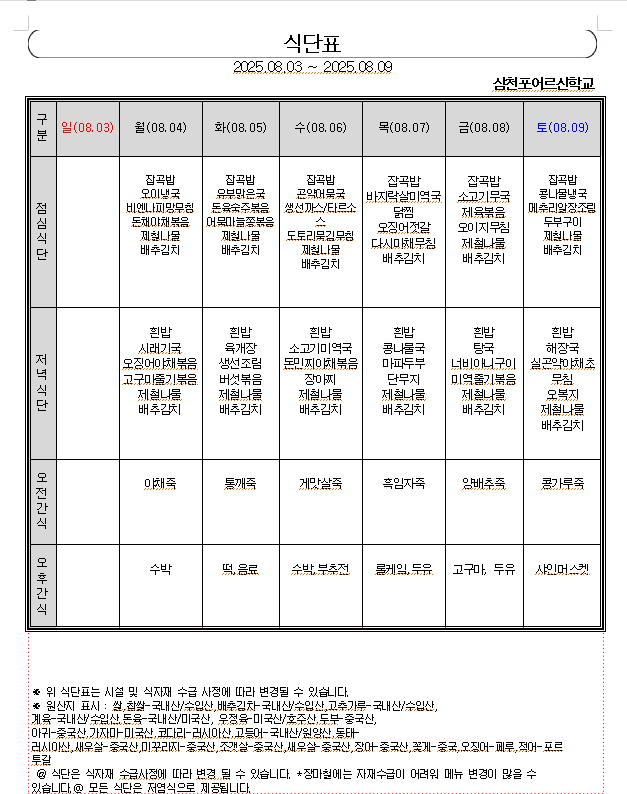 2025년 8월 첫째주 식단표 페이지 정보 작성자 운영자 작성일25-08-13 16:16 조회10회 댓글0건 본문 2025년 8월 첫째주 식단표입니다 댓글목록 등록된 댓글이 없습니다. 이전글 다음글 목록