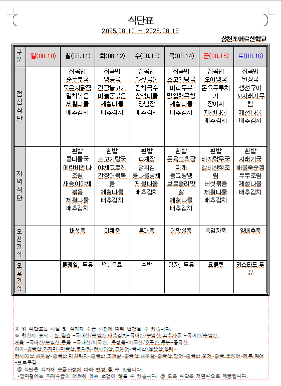 2025년 8월 둘째주 식단표 페이지 정보 작성자 운영자 작성일25-08-13 16:16 조회39회 댓글0건 본문 2025년 8월 둘째주 식단표 입니다 댓글목록 등록된 댓글이 없습니다. 이전글 다음글 목록