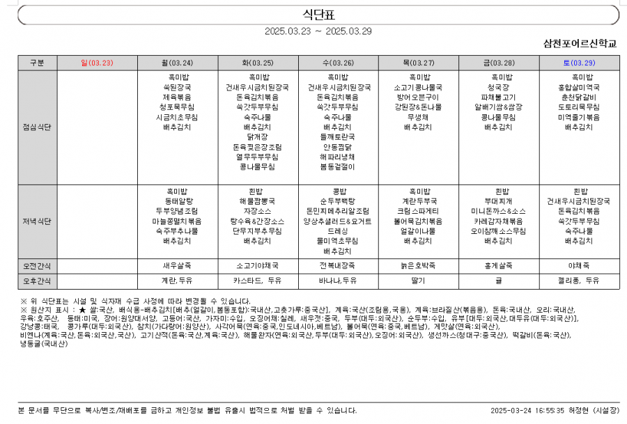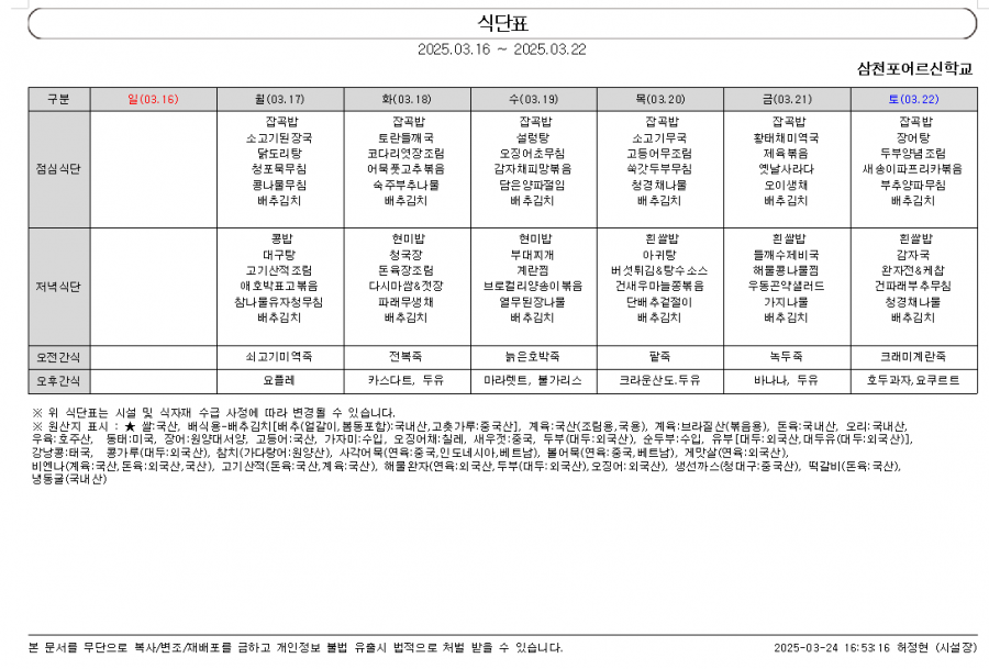 2025년 3월 식단표입니다.2 페이지 정보 작성자 운영자 작성일25-03-24 17:15 조회21회 댓글0건 본문 3월 식단표 댓글목록 등록된 댓글이 없습니다. 이전글 다음글 목록