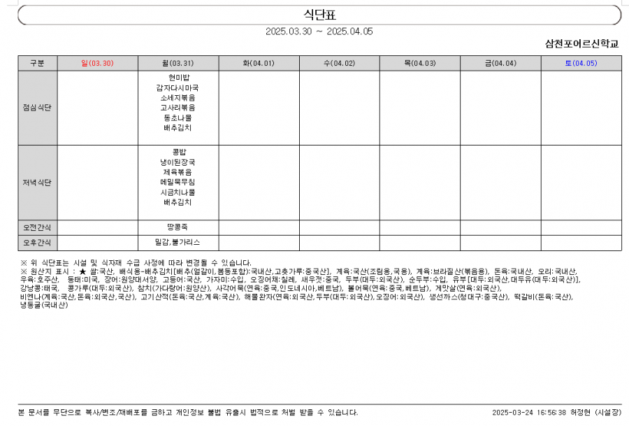 2025년 3월 주간식단표입니다3 페이지 정보 작성자 운영자 작성일25-03-24 17:16 조회45회 댓글0건 본문 3월 주간식단표 댓글목록 등록된 댓글이 없습니다. 이전글 다음글 목록
