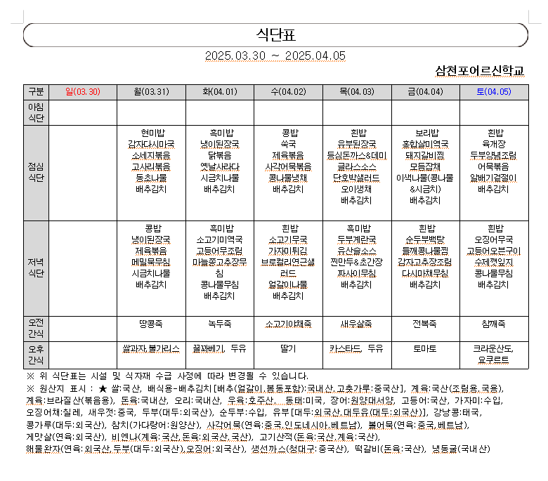 2025년 4월 첫째주 식단표 페이지 정보 작성자 운영자 작성일25-03-31 10:17 조회44회 댓글0건 본문 2025년 4월 첫째주 식단표입니다 댓글목록 등록된 댓글이 없습니다. 이전글 다음글 목록