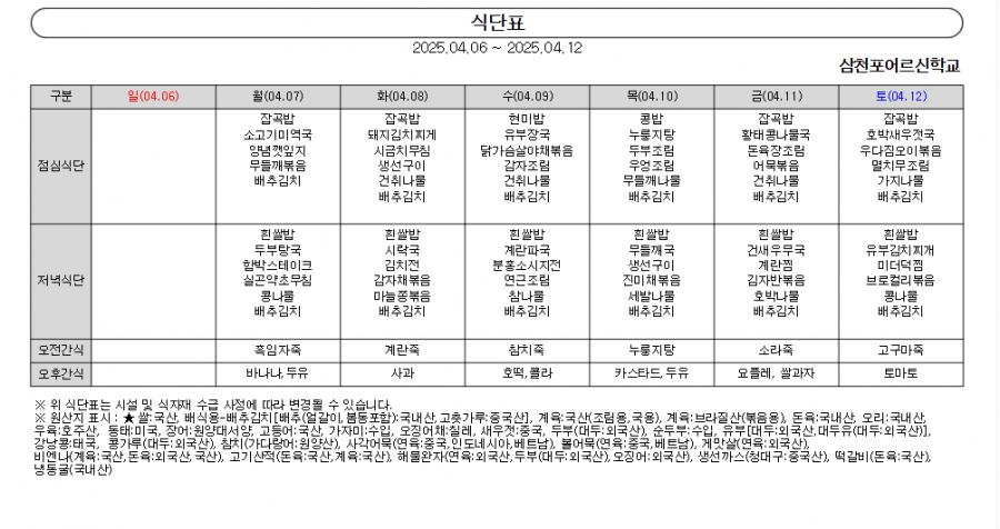 2025년 4월 둘째주 식단표 페이지 정보 작성자 운영자 작성일25-04-08 15:07 조회31회 댓글0건 본문 4월 둘째주 식단표입니다 댓글목록 등록된 댓글이 없습니다. 이전글 다음글 목록
