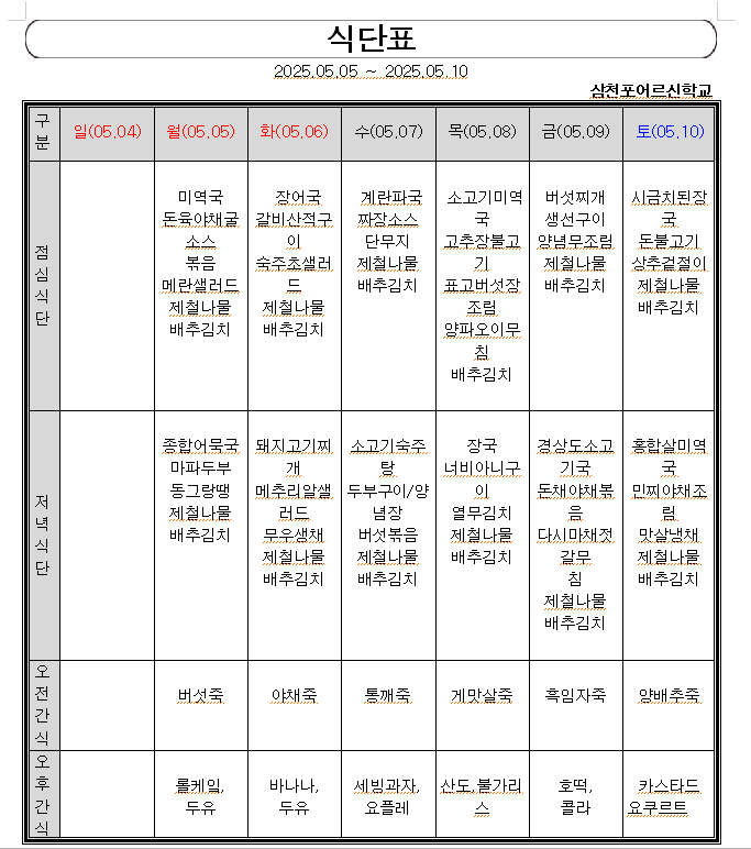 2025년5월 첫째주 식단표 페이지 정보 작성자 운영자 작성일25-05-07 16:07 조회31회 댓글0건 본문 2025년5월 첫째주 식단표입니다. 댓글목록 등록된 댓글이 없습니다. 이전글 다음글 목록