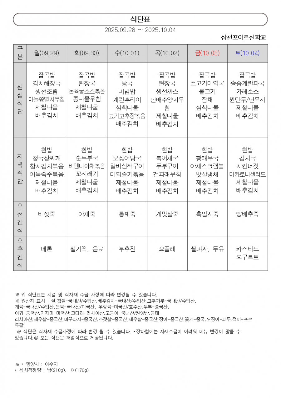 9월 다섯째주 / 10월 첫째주 식단표 페이지 정보 작성자 운영자 작성일25-09-26 16:32 조회22회 댓글0건 본문 9월 다섯째주 / 10월 첫째주 식단표입니다. 댓글목록 등록된 댓글이 없습니다. 이전글 다음글 목록