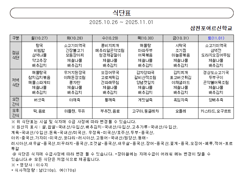 2025년 10월 다섯째주 식단표 > 주간식단표