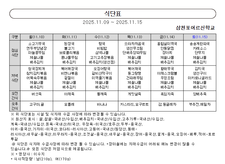 2025년 11월 둘째주 식단표